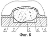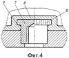Матрицу 5 перемещают навстречу заготовке по направляющим корпуса 2, благодаря этому происходит дополнительная деформация материала заготовки выступающей над поверхностью матрицы частью детали-компонента 7 и частичное заполнение конструктивного элемента – поднутрения 9. Аналогично материал заготовки затекает и в элемент 10 (фиг.3 и 4). Дальнейший процесс формовки сопровождается заполнением материалом заготовки донной и периферийной частей формообразующей полости матрицы 5, которая для обеспечения требуемых размеров изделия по высоте фиксируется на нужном уровне в корпусе 2 устройства.