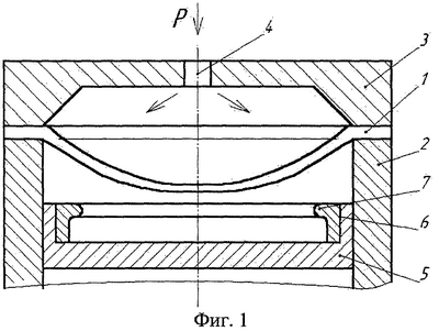 Известны способы получения изделий из листовых заготовок равномерно распределенным деформирующим усилием подвижной среды в жесткой матрице с прижимом заготовки (см., например, Исаченков Е.И. Штамповка резиной и жидкостью. – М.: Машиностроение, 1967, с.164, рис.85).