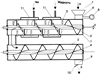 Активный ил и опилки проходят (стрелка А) через подающий дозатор 7, где они смешиваются в должном соотношении. Например, с целью получения топливных брикетов – 1 часть ила к 2-3 частям опилок. С целью получения компоста – 1 часть ила к 0,3-1 части опилок. С целью получений рассадных горшочков – 1 часть ила к 1-2 частям опилок и 1 части торфа. При необходимости, с целью получения компоста к смеси добавляют до 0,5 части глины или суглинков. Далее смесь поступает во входное отверстие 6 и в зоне канала аэрационной трубы 8 подвергается обдуву. Осуществляется частичная оксигинация смеси и ее разрыхление. Смесь попадает в полость корпуса 1 и шнеком 3 постепенно продвигается в противоположный конец корпуса 1, который соединен с полостью корпуса 2. Поверхность шнека 3 выполнена с разрывами, а сквозь стенку корпуса 1 соответственно разрывам поверхности шнека 3 установлены трубчатые пальцы 5, что приводит к тому, что при поступательно-вращательном движении смеси она взаимодействует с пальцами 5 и значительно интенсивнее перемешивается. При этом смесь подвергается многократному давильному и дробильному воздействию, что приводит к высокой гомогенизации смеси, значительному усилению поверхностно-активных процессов и интенсификации разнообразных химических реакций между ингредиентам смеси. С целью получения компоста в один из картеров 11 подается (при необходимости) воздух, воздушно-кислородная смесь или озон, или раствор с термофильными бактериями. При этом в другой картер могут подаваться калийные или азотные удобрения. Через трубчатые азотные удобрения. Через трубчатые пальцы 5 с отверстиями в стенках указанные вещества поступают в полость корпуса 1 и добавляются в смесь, где они перемешиваясь, участвуют или создают необходимые условия для желаемых химических и биохимических процессов. Если для ускорения получения компоста необходимо повысить температуру смеси или температура смеси на входе была недостаточной, то в картер 11 может быть подан теплоноситель (вода или раствор) либо подогретый газ, или ингредиент в жидкой фазе. Смесь поступает в корпус 1, где она перемещается шнеком 4 к выходному отверстию 9. Для отделения теплоносителя или лишней жидкости корпусы 1 и 2 установлены под углом к горизонту, а в корпусе 2 выполнено щелевое отверстие (не показано). Давление, которое при вращении создает шнек 4, а также дополнительное сопротивление, которое создается заслонкой 10 в выходном отверстии 9, способствует отделению жидкости от смеси. Жидкость стекает по щелевому отверстию в соответствующий сборник (не показан). Далее смесь выходит (стрелка Б) из отверстия 9 и с целью получения компоста укладывается в бурт. Если целью являлось получение смеси для формования топливных брикетов или рассадных горшочков, то ее подают на формовочное устройство (не показано).