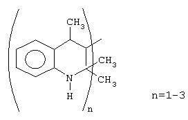 Решение поставленной задачи позволяет расширить арсенал эффективных, с улучшенными эксплуатационными характеристиками, стабилизаторов для защиты резин от теплового старения. Характеристика веществ, используемых в составе Полимер 2,2,4-триметил-1,2-дигидрохинолин выпускают под торговым названием “Ацетонанил Р” в виде гранул от светло-серого до темно-янтарного цвета. Температура плавления 70-85°С. ТУ 6-02-1116-“Ацетонанил Р”. Химическая формула мономера