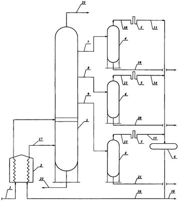 Сырье – отбензиненная нефтяная или нефтегазоконденсатная смесь – по линии 1 подается в трубчатую печь 2, где нагревается до 360°С, и поступает на фракционирование в атмосферную колонну 3. Потоки флегмы боковых погонов керосиновой, соляровой и газойлевой фракций по линиям 7, 8 и 9 поступают в отпарные колонны 4. Головные погоны отпарных колонн 4 – паровые отгоны керосиновой, соляровой и газойлевой фракций по линиям 10, 11 и 12 – направляются в конденсаторы-холодильники 5, где охлаждаются и конденсируются. Сконденсированные отгоны керосиновой, соляровой и газойлевой фракций по линиям 13, 14 и 15 поступают на смешение в емкость отгона 6. Смесь сконденсированных потоков отгонов представляет собой широкую фракцию углеводородов, выкипающих в температурном интервале 100-300°С. Количество сконденсированного потока отгонов при работе установки в режиме с максимальным отбором дизельного топлива составляет до 18 мас.% от суммы керосиновой фракции и дизельного топлива: (750+1950)·0,18=486 тыс. т/год. Сконденсированный поток отгона по линии 16 направляется в трубчатую печь 2, где нагревается до 360°С, и по линии 17 в паровой фазе поступает в отгонную часть атмосферной колонны 3 в качестве испаряющего агента в количестве, определяемом по формуле (1), Незначительный избыток сконденсированного потока отгона по линии 18 может выводиться с установки в качестве резерва испаряющего агента или компонента дизельного топлива.