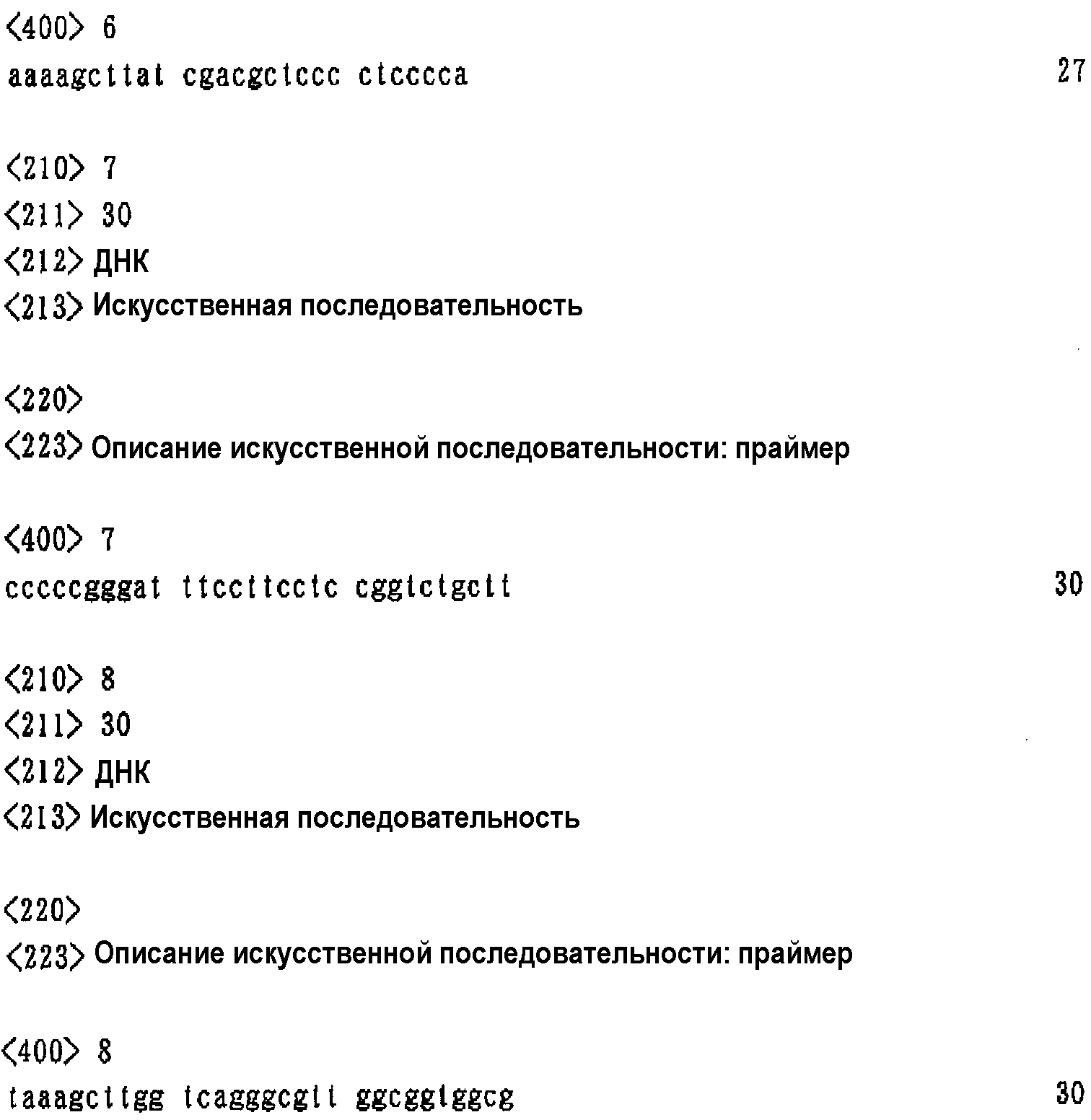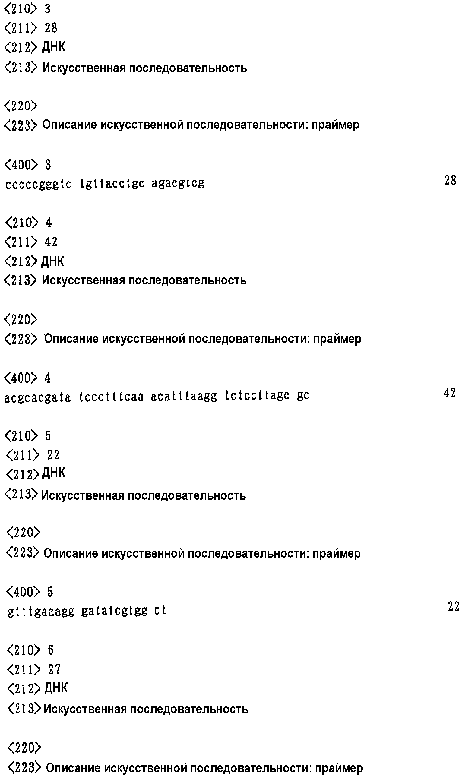 Кроме того, ген edd и ген eda, используемые для данного изобретения, не ограничены генами дикого типа и могут быть мутантами или искусственно модифицированными генами, кодирующими генные продукты, включающими замену, делецию, инсерцию, присоединение и тому подобное одной или нескольких аминокислот в одном или нескольких участках, при условии, что функции кодируемых EDD и EDA не нарушаются. Хотя количество “несколько” аминокислот, упоминаемое в данном описании, различно в зависимости от положения и типа аминокислотных остатков в трехмерной структуре белка, оно более конкретно может составлять от 2 до 60, предпочтительно от 2 до 40, более предпочтительно от 2 до 20. Кроме того, в качестве ДНК, кодирующей белок в значительной степени идентичный вышеуказанным EDD и/или EDA, можно указать ДНК, которая гибридизуется с нуклеотидными последовательностями известного гена edd или гена eda (например, в GenBank с инвентарными номером L20897, X58364, M60615, M37982) или зондом, который можно получить из указанных нуклеотидных последовательностей, в жестких условиях и кодирует белок, обладающий активностью, сходной с активностью EDD или EDA. “Жесткие условия” в данном описании относятся к условиям, при которых образуются так называемые специфичные гибриды, а неспецифичные гибриды не образуются. Такие условия трудно четко выразить с использованием числовых значений. Однако жесткие условия, например, включают условия, при которых ДНК, имеющие высокую степень гомологии, например, ДНК, имеющие гомологию 50% или выше, гибридизуются друг с другом, а ДНК, имеющие гомологию ниже, чем указанная выше, не гибридизуются друг с другом. Альтернативно примером жестких условий являются условия, при которых ДНК гибридизуются друг с другом при концентрации соли, соответствующей обычным условиям промывки при Саузерн-гибридизации, т.е. 1ЧSSC, 0,1% SDS, предпочтительно 0,1ЧSSC, 0,1% SDS при 60°С.