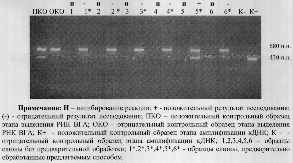 Вместе с тем, предварительные опыты показали принципиальную возможность использования метода ОТ-ПЦР для исследования водных концентратов и слюны. Способ осуществляется следующим образом: пробы речной воды, предварительно сконцентрированные с помощью используемых в практике способов концентрирования вируса гепатита А (далее концентраты речной воды), и образцы слюны, полученные от больных гепатитом А, исследовали методом ОТ-ПЦР с применением тест-системы «АмплиСенс HAV-430» согласно инструкции в четыре этапа, включающие выделение РНК; получение комплементарной ДНК (кДНК) на матрице РНК – реакция обратной транскрипции (ОТ); амплификацию участка кДНК – полимеразная цепная реакция (ПЦР); электрофоретический анализ продуктов ПЦР с учетом результатов ПЦР-анализа. По результатам анализа в ряде проб отсутствовали как специфические полосы, так и сигнал ВКО, что свидетельствовало об ингибировании ОТ-ПЦР. Утверждать о наличии вируса или отсутствии его в пробе не представлялось возможным в связи с получением ложноотрицательного результата исследования.
