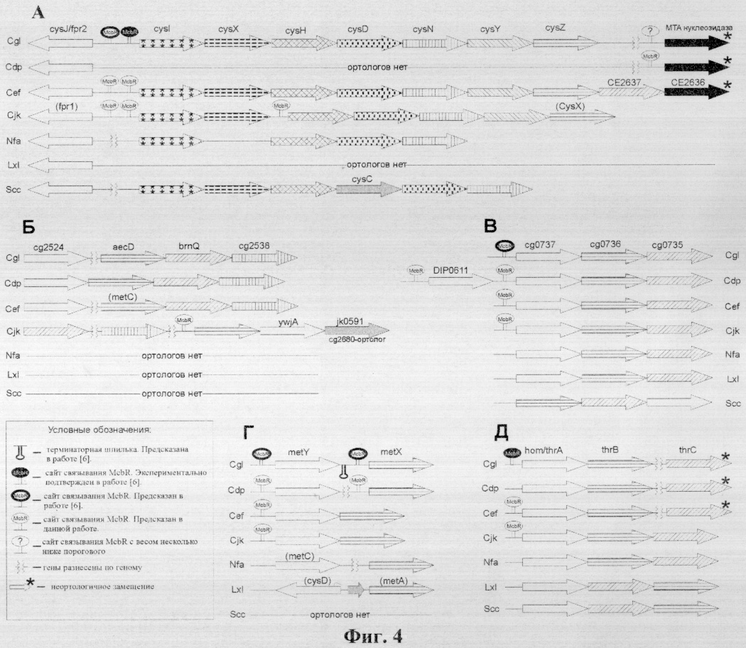 Несмотря на невозможность изучения регуляции в филогенетически более далеких геномах вследствие значительно повышенного GC-состава этих геномов, исследование потенциальных сигналов в четырех геномах рода Corynebacterium позволяет заключить, что большинство генов регулона McbR сохраняет регуляцию со стороны этого репрессора. В большей части случаев потенциальный сигнал сохраняется перед исследуемым ортологичным геном, однако в некоторых ситуациях вследствие различного относительного расположения генов потенциальный сайт связывания может находиться в регуляторной области другого гена. Например, гены metX и metY могут формировать независимо регулирующиеся моноцистронные локусы или же единый оперон с сигналом перед геном metY (фиг.4, позиция Г), а дивергон утилизации сульфата cysJIHDNZY C.glutamicum в геноме C.jeikeium разрывается на независимо регулирующиеся дивергон cysJIX и оперон cysHDNYZ (фиг.4, позиция А).