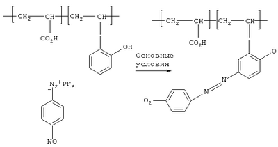 b) в другом варианте осуществления меченые звенья сополимера представляют собой звенья, производные от ацетоксистирола, предпочтительно гидролизованного 4-ацетоксистирола, или от ортоаллилфенола (он представляет собой спирт, который взаимодействует с диазонием). Эти звенья могут быть обнаружены посредством любого подходящего способа, такого как колориметрический способ, после воздействия реагента для обнаружения, такого как соль диазония. Интенсивность цвета, создаваемая продуктом реакции, может быть измерена при помощи УФ-видимого спектрофотометра. Подходящая соль диазония представляет собой п-нитробензолдиазонийгексафторфосфат. Считается, что интенсивность цвета связана с концентрацией продукта реакции (которая эквивалентна концентрации полимера) по закону Бера-Ламберта. Концентрации полимера определяются путем сравнения интенсивности цвета образца полимера с калибровочной кривой, полученной для образцов полимера с известной концентрацией. Для осуществления реакции 4-ацетоксистирол должен иметь свою группу сложного эфира, гидрированного спиртом посредством кипячения раствора. Поглощение может быть измерено при 500 нм. Следующая схема представляет собой пример с ортоаллилфенолом: с) В другом варианте осуществления меченые звенья сополимера представляют собой звенья, производные от мономера, имеющего следующую формулу: X2C=CYY’, в которой: – X, который является идентичным или различным, представляет собой атом водорода или алкильную группу С1-С4, – Y представляет собой атом водорода или алкильную группу С1-С4, – Y’ представляет собой группу, имеющую формулу -L-Arom, в которой – L представляет собой ковалентную связь или двухвалентную органическую связывающую группу, возможно содержащую гетероатомы, и – Arom представляет собой группу, содержащую по меньшей мере два сопряженных ароматических кольца, предпочтительно по меньшей мере три, причем указанные кольца содержат сопряженные атомы углерода и возможно атомы азота или кислорода, и связанные с указанными атомами углерода, атомы водорода или заместители. Arom предпочтительно представляет собой группу, имеющую по меньшей мере 10 сопряженных атомов углерода, предпочтительно по меньшей мере 14 атомов углерода в по меньшей мере трех сопряженных ароматических кольцах. Сопряженные ароматические кольца предпочтительно представляют собой кольца С5 или С6. Arom преимущественно представляет собой группу, имеющую составляющую нафталина, антрацена, пирена или фенантрена, причем указанная составляющая может иметь заместители. L предпочтительно представляет собой ковалентную связь или двухвалентную алкильную группу С1-С12, или группу, имеющую формулу -О-, -СО-О-, СО-NH- или -О-СО-. Особенно предпочтительными мечеными звеньями являются звенья, производные от винилантрацена, предпочтительно от 9-винилантрацена.