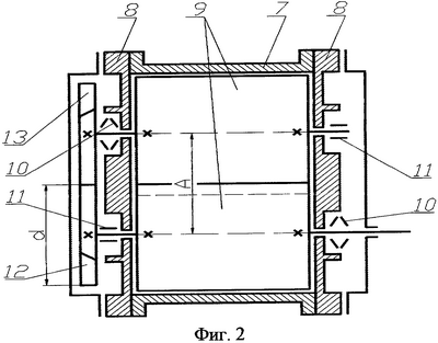 На валах роторов 9 размещены с одной стороны синхронизирующие косозубые шестерни 12 и 13 такими образом, что одна из этих шестерен, плавающая, 12, закреплена у плавающей опоры 11, а другая из этих шестерен, зафиксированная, 13, закреплена у фиксированной опоры 10.
