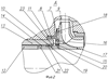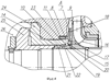 На фиг.4 насос снабжен кольцом 7 с буртом 8. Кольцо 7, установленное на ступице 10 колеса 5, прикреплено к ведущему диску 9 колеса 5 и образует буртом 8 с неподвижным кольцом 24, установленным на крышке 2, верхнее радиальное щелевое уплотнение 11. Насос имеет разгрузочный диск 25, расположенный на валу 4 за ступицей 10, образующий с неподвижным кольцом 24 торцовый подшипник скольжения с торцовым зазором 6, причем ступица 10 и неподвижное кольцо 24 составляют нижнее радиальное щелевое уплотнение 14. Камера 15, образованная между неподвижным кольцом 24, кольцом 7, верхним 11 и нижним 14 радиальными щелевыми уплотнениями, соединена с входом 16 колеса 5 аксиальными отверстиями 17, проходящими через ведущий диск 9 и кольцо 7. Кольцо 7 имеет радиальные каналы 18, при этом находящаяся в ступице 10 кольцевая расточка 19 соединена первой группой отверстий 20 с радиальными каналами 18, а второй группой отверстий 21 – с нижним радиальным щелевым уплотнением 14, причем первая и вторая группы отверстий расположены в ступице 10 рабочего колеса 5. На части нижнего щелевого уплотнения 14 со стороны камеры 15 на ступице 10 и на неподвижном кольце 24 выполнены винтовые нарезки 22 и 23, направляющие жидкость в сторону камеры 15.