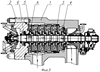 2. Центробежный многоступенчатый насос, содержащий корпус, крышку, рабочие колеса, установленные на валу, причем за рабочим колесом последней ступени расположен подшипник скольжения, соприкасающийся с перекачиваемой жидкостью, отличающийся тем, что насос снабжен кольцом с буртом, прикрепленным к ведущему диску рабочего колеса последней ступени, установленным на ступице упомянутого колеса и образующим при этом своим буртом с крышкой верхнее радиальное щелевое уплотнение, причем насос снабжен разгрузочным диском, расположенным на валу за ступицей рабочего колеса последней ступени и образующим с неподвижным кольцом, установленным на крышке, торцовый подшипник скольжения, а между ступицей упомянутого колеса и неподвижным кольцом образовано нижнее радиальное щелевое уплотнение, при этом камера, образованная между неподвижным кольцом, кольцом с буртом, верхним и нижним радиальными щелевыми уплотнениями, соединена с входом колеса аксиальными отверстиями, проходящими через ведущий диск этого колеса и кольцо с буртом, имеющее радиальные каналы, при этом находящаяся в ступице кольцевая расточка, расположенная со стороны вала, соединена первой группой отверстий с радиальными каналами, а второй группой отверстий – с нижним радиальным щелевым уплотнением, причем первая и вторая группы отверстий расположены в ступице рабочего колеса последней ступени, а на части нижнего радиального щелевого уплотнения со стороны камеры на ступице рабочего колеса последней ступени и на неподвижном кольце выполнены винтовые нарезки, направляющие жидкость в сторону камеры.