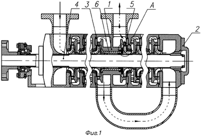 На фиг.1 изображен центробежный насос, продольный разрез, фиг.2 – узел А продольного разреза насоса. На фиг.1 насос содержит корпус 1, крышку 2, рабочие колеса 3, установленные на валу 4. За рабочим колесом последней ступени 5 расположен радиальный подшипник скольжения с зазором 6 (радиальным).