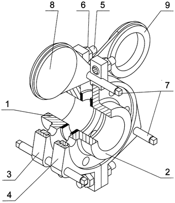 Устройство собрано на фланцах 1, 2 трубопровода. Разъемные захваты 3 и 4 стянуты на фланцах шпильками 5 и гайками 6. Между собой захваты связаны монтажными шпильками 7, каждая из которых установлена параллельно трубопроводу на резьбовых соединениях противоположного направления. Шпильки 7 оснащены концевыми квадратами под ключ. На одной из шпилек 7 установлены поворотные вкладыши 8 и 9. Непроходной вкладыш 8 выполнен в форме глухого диска, а проходной вкладыш 9 – в форме кольцевого диска. Вкладыши оснащены проушинами для посадки на шпильки.