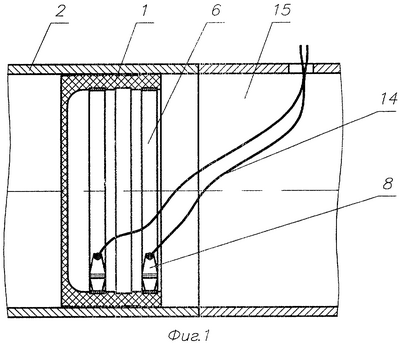 При перекрытии внутренней полости трубопровода в открытый ее конец вставляется манжета 1, а в манжету – пружинная лента 6, при этом рычаг 8 вводится в зацепление с зацепом 9, а верхняя часть этого рычага максимально отходит от рычага 7, далее в прорезь рычага 8 вставляется стяжной винт 12, после чего завинчиванием гайки 13 верхние концы рычагов сходятся, а нижние расходятся, раздвигая концы пружиной ленты 6, тем самым прижимая ее к манжете. Аналогично работает и второе устройство, устанавливаемое в трубопроводе с противоположной стороны от первого. После завершения подгонки катушки 15 тросики 14 обоих концов пружинных лент 6 выводятся наружу через отверстие в катушке. После окончания сварочных работ пружинные ленты 6 поочередно извлекаются из трубопровода 2 тросиком 14, потянув за который винт 12 с гайкой 13 выходит из прорези рычага 8, а рычаг 7 из зацепа 9 и освободившийся конец пружинной ленты легко выходят из трубопровода. Манжета 1 не извлекатся из трубопровода, т.к. в дальнейшем она теряет свою прочность, раскисает и растворяется в перекачиваемом продукте.