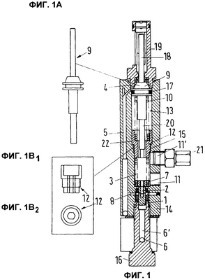 Распределительный поршень 9 в исходном положении, показанном на фиг.1, контрольным стержневым участком 18 может вдаваться в верхнее, открытое сбоку закрывающее тело 19 для оптического показания функционирования. В направлении поршня 1 клапана распределительный поршень 9 может иметь удлиненную часть 20 для обратного смещения поршня 1 клапана в направлении его исходного положения перед окончанием цикла смазывания вначале в промежуточное положение, что ниже будет еще описано. Корпус 14 клапана имеет, по меньшей мере, одно выпускное отверстие 11 для смазочного материала, которое в представленном на фиг.1 исходном положении поршня 1 клапана при необходимости расположено непосредственно перед его торцевой поверхностью, лежащей со стороны распределительного поршня. Снабженное навинчивающейся крышкой 21 пропускное отверстие 11′ может служить, например, для заполнения распределительного элемента смазочным материалом.