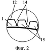 Горячая газовоздушная смесь через газоподводящий патрубок 1 по касательной поступает в газораспределительный канал 11 газораспределительной камеры 4 и распределяется на два потока: основной поток поступает навстречу высушиваемого материала в зону постоянной скорости сушки и второй поток, движущийся по ходу высушиваемого материала – в зону падающей скорости сушки. Из газораспределительного канала 11 горячая газовоздушная смесь поступает в наклонные плоские сужающиеся сопла 14 и в виде струй со скоростью 35…45 м/с направляется на поверхность высушиваемого материала и, отражаясь от него, поступает в газоотводящие каналы 15 и по ним переходит в боковые газосборные каналы 16. Из первой по ходу высушиваемого материала полости боковых газосборных каналов 16 газовоздушная смесь отобрана из зоны постоянной скорости сушки и содержит повышенное количество водяных паров, и она через газоотводящие патрубки выброса 3 отводится из установки и выбрасывается в атмосферу. Во второй полости газовоздушная смесь отобрана из обеих зон сушки (постоянной и падающей скорости сушки). Эта часть (75…80% от исходной горячей газовоздушной смеси) газовоздушной смеси содержит пониженное количество водяных паров и через газоотводящие патрубки рециркуляции 2 направляется на повторное использование.