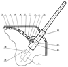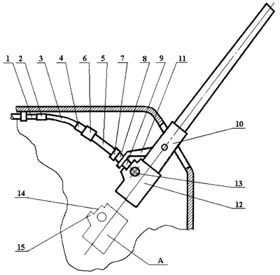Схема артиллерийского орудия со стыковочным механизмом представлена на чертеже, где обозначено: 1 – торец шнекового рукава; 2 – соединительная муфта; 3 – гибкий шланг (верхний); 4 – телескопический патрубок шланга 3; 5 – гибкий шланг (нижний); 6 – телескопический патрубок шланга 5; 7 – соединительная муфта; 8, 9 – упругий и жесткий патрубки приемника; 10 – люлька артиллерийского орудия; 11 – кронштейн люльки; 12 – ствол артиллерийского орудия; 13 – кран узла бокового ввода заряда; 14 – торец узла бокового ввода заряда; 15 – ограничитель; А – положение ствола при полном откате.