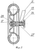 Изменение колеи осуществляется посредством перемещения штанг 18 и 19 внутри оси 20 двуноги-лафета, фиксирующихся пальцами 7. Штанги 18 и 19 могут легко выниматься и вставляться в ось 20 двуноги-лафета. Колеса 17 со ступицами 26 и полуосями 27 могут легко сниматься и крепятся к балансирам 11 и 12 с помощью маховиков 14, стопорящихся фиксаторами 13. Балансиры крепятся к осям 23 с торсионами 21 и 22 посредством пальцев 24, закрепленных в штангах 18 и 19, на которых посредством пальцев 6 закреплены сошники левый 5 и правый 16.