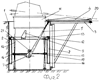 При вращении ходового винта 19 в противоположном направлении балки 15 и 16 перемещаются навстречу друг к другу, звенья 14 складываются, рама 12 с огневой установкой 11 по вертикальным направляющим 2 опускается вниз, а в конце опускания ее рейки 9 и 10 через зубчатые секторы 7 и 8 поворачивают рычаги 5 и 6, которые надвигают крышку 4 на контейнер 1.