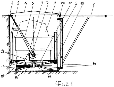 При дистанционном включении привода 21 осуществляется вращение ходового винта 19, который через гайки 17 и 18 разводит балки 15 и 16 в противоположных направлениях, при этом вертикальные звенья 14 обоих четырехзвенников распрямляются, перемещая подъемную раму 12 с огневой установкой 11 вдоль вертикальных направляющих 2. Ограничительные ролики 13 рамы 12 обеспечивают строго вертикальное перемещение последней. Рейки 9 и 10, закрепленные на раме 12, в начале подъема поворачивают зубчатые секторы 7 и 8, а следовательно, и рычаги 5 и 6, которые сдвигают крышку 4 на опорных роликах 20 вдоль направляющих 3, обеспечив свободный выход огневой установки 11 из контейнера 1 в боевое положение.