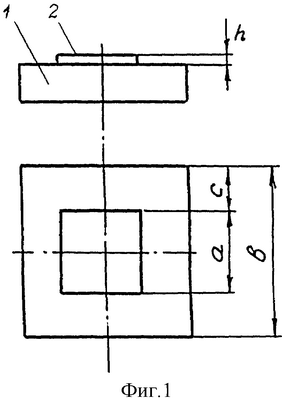 На фиг.1 показан чертеж ступенчатой меры толщины покрытий, где 1 – основание, 2 – покрытие, h – толщина покрытия, а – размер стороны площадки покрытия, с – размер непокрытой части основания, в – размер стороны основания.