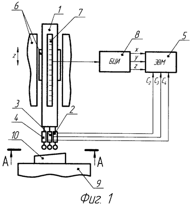 Устройство работает следующим образом. Пиноль 1 с закрепленными нулевыми головками 2, 3, 4 перемещается до соприкосновения всех измерительных наконечников указанных головок с поверхностью измеряемой детали 10, установленной на столе 9. При последовательном касании измерительных наконечников измеряемой поверхности (зазор сведен до нуля) выдаются сигналы С2, С3, С4, по которым осуществляется съем показаний координат с датчика перемещений 7, которые обрабатываются ЭВМ 5.