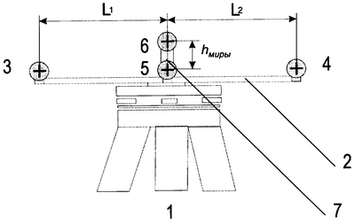 Мира содержит закрепленную на штативе 1 базовую горизонтальную штангу 2 фиксированной длины L, на концах которой и в центре установлены соответственно контрольные марки 3, 4 и 5, например, в виде отражателей. Над центральной контрольной маркой 5 на фиксированном расстоянии h размещена вертикальная контрольная марка 6, установленная на конце базовой вертикальной рейки 7, которая другим концом жестко соединена с горизонтальной штангой 2 в центре.
