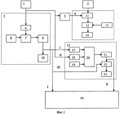 Кроме того, блок 15 определения средней скорости движения автомобиля состоит из элемента 17 И-НЕ, триггера 18, второго генератора 19 импульсов, элемента 20 И, третьего счетчика 21 импульсов, делителя 22, третьего индикатора 23, причем первый и третий входы блока 15 определения средней скорости движения являются соответственно входами элемента 17 И-НЕ и вторым входом делителя 22, а второй вход является входом триггера 18, выход элемента 17 И-НЕ, выход триггера 18 и выход второго 19 генератора импульсов соединены соответственно с первым, вторым и третьим входом элемента 20 И, выход которого через третий 21 счетчик соединен с первым входом делителя 22, выход которого соединен со входом третьего 23 индикатора и одновременно со вторым входом блока определения времени движения автомобиля до пунктов назначения.