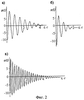 Измерения механических свойств полимеров в процессе отверждения осуществляют следующим образом. С ЭВМ по команде оператора подается импульс на блок задания начального отклонения 11, при этом инерционный диск 3 отклоняется от начального положения на 3-5 градусов и растягивает резиновый шнур. После этого автоматически блок начального отклонения 11 освобождает диск 3 и под действием упругого элемента 4 и образца 2 начинаются затухающие колебания крутильного маятника. Зависимость угла поворота маятника от времени (Т) записывается с помощью датчика угла поворота 10 в память ЭВМ. Частота опроса датчика составляет 1 кГц, что примерно в сто раз больше частоты возможных колебаний маятника. Первоначально производится запись затухающего колебания для пустой кюветы. Затем кювета заполняется исследуемым образцом 2 в жидком состоянии. После этого цикл измерений повторяется на заданном временном интервале в автоматическом режиме через промежутки времени, в несколько раз превышающие время полного затухания колебаний. Каждое измерение представляет собой запись зависимости угла поворота маятника от времени для одного затухающего колебания маятника. Время всего цикла измерений выбирается таким образом, чтобы образец перешел от жидкого состояния к твердому. При этом в жидком состоянии при увеличении вязкости возрастает затухание колебаний и уменьшается частота колебаний. При формировании структуры твердой фазы модуль сдвига образца становится отличным от нуля, что приводит к увеличению эффективного модуля кручения маятника, вследствие чего уменьшается затухание и возрастает частота колебаний. На фиг.2 приведены цифровые осциллограммы колебаний для пустой кюветы (а), для кюветы с образцом в сильновязком состоянии (б) и при полном отверждении образца (в). На основе записанных цифровых осциллограмм с высокой точностью определяются частота колебаний и коэффициент затухания.