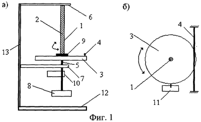 Устройство содержит крутильный маятник, состоящий из кюветы 1, в которую заливается образец 2, инерционного диска 3 с заданным моментом инерции, упругого элемента 4 и оси крепления 5. Кювета представляет собой тонкостенную трубку и обладает минимальным коэффициентом упругости по отношению к крутильным колебаниям и минимальным коэффициентом внутреннего трения, и фактически не оказывает влияние на характер колебаний маятника. Кювета 1 может быть изготовлена, например, из полиэтиленовой пленки. Кювета 1 закреплена верхним концом на основании 6. Нижний конец кюветы соединен с инерционным диском 3, который с помощью оси 5 установлен в подшипниковом узле 7. При этом ось 5 может свободно вращаться и вертикально перемещаться вверх и вниз, что необходимо для задания натяжения кюветы 1 с помощью блока 8. Образец 2 в жидком состоянии заливается в кювету 1 с помощью узла 9, закрепленного на инерционном диске 3. За счет постоянного осевого натяжения кюветы не происходит ее деформации при заливании образца. Ось 5 соединена с датчиком угла поворота 10, который подключается к ЭВМ. К диску 3 также прикреплен упругий элемент 4, изготовленный из тонкого резинового шнура, и блок задания начального отклонения 11. Все узлы системы закреплены на основании 12 и на стойке 13.