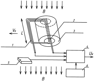 В случае, когда величина В заранее не известна, в устройстве используется датчик магнитного поля – магнитометр 5. С его помощью и при необходимости с использованием вычислительных ресурсов бортового вычислителя 4 определяется вертикальная составляющая магнитного поля Земли в месте движения объекта. После этого определение скорости движения объекта Vx осуществляется аналогичным способом по формуле (2) или (4) с использованием измеренной величины В.