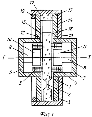 Акселерометр содержит маятниковый ЧЭ в виде кварцевой пластины 1 (маятник), соединенной посредством упругого подвеса 2 с опорным кольцом 3. Эти три детали выполнены из единой заготовки плавленого кварца и называются центральной кварцевой пластиной. В состав акселерометра входят также узел силовой компенсации, включающий две катушки 4, 5, установленные на пластине 1, и две магнитные системы, каждая из которых состоит из магнитопровода 6 (7), постоянного магнита 8 (9) с полюсным наконечником 10 (11). Сборка устройства выполнена с помощью неподвижных металлических пластин 12, 13 и колец 14, 19. На подвижной пластине 1 расположены обкладки 15, 16 преобразователя перемещения, выполненные в виде металлизированного напыления, а пластины 12, 13 выполняют функции его неподвижных обкладок. Рабочий зазор обеспечивается с помощью платиков 17, расположенных на опорном кольце. Для снижения механических напряжений, возникающих в верхней части центральной кварцевой пластины, между средними платиками 17 и упругим подвесом 2 на опорном кольце 3 введены два утонения (впадины) 18.