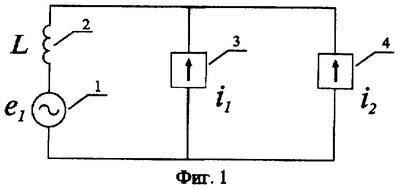 Фиг.1 содержит источник результирующей ЭДС 1 (e1), являющийся эквивалентом сложной энергосистемы, сосредоточенный результирующий реактанс системы индуктивного типа 2 (L) ветви с этой ЭДС, примыкающей к узлу энергосистемы, токи источников токов 3 и 4 (i1 и i2), эквивалентирующих нелинейные нагрузки. При этом источник тока 3 (i1) может быть источником тока одной парциальной нагрузки, влияние которой на качество напряжения в узле энергосистемы и определяется. Тогда ток источника 4 (i2) может представлять источник суммарного тока всех остальных нагрузок узла.