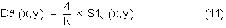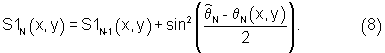 где S1N-1(х, у), S1N(х, у) – соответственно результаты накопления разности измеренных и расчетных значений пеленга на предшествующем (N-1) и текущем (N) периоде измерения для точки пространства с координатами (х, у).