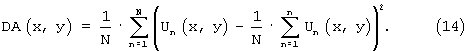 Однако для получения оценок дисперсии (11), (12) рекуррентным методом не требуется хранить все предшествующие значения разности измеренных и расчетных значений пеленга и нормированной амплитуды Un(х, у), достаточно добавить вновь поступившие результаты измерений к ранее накопленным значениям согласно формулам (8)-(10), что не требует увеличения вычислительного ресурса, прежде всего емкости запоминающих устройств, и упрощает техническую реализацию предлагаемого способа.