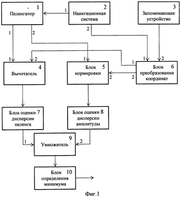 Полученные (6), (7) результаты поступают на блоки оценки дисперсии пеленга 7 и амплитуды 8 соответственно, где их накапливают.