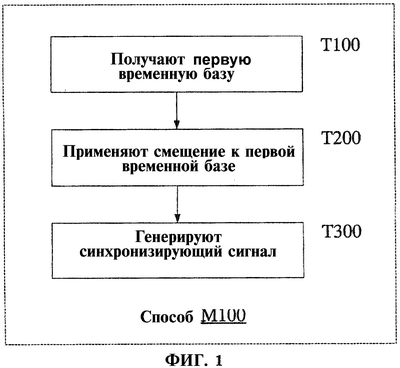 Фиг.1 показывает последовательность операций для способа M100 согласно варианту осуществления изобретения. Программный модуль T100 получает первую временную базу из сигнала, принятого от передатчика на земле («принятый сигнал»). Программный модуль T200 применяет предопределенное смещение к первой временной базе для получения второй временной базы. Предопределенное смещение основано на задержке распространения принятого сигнала. Программный модуль T300 генерирует синхронизирующий сигнал, временной сдвиг кода для которого основан на второй временной базе.