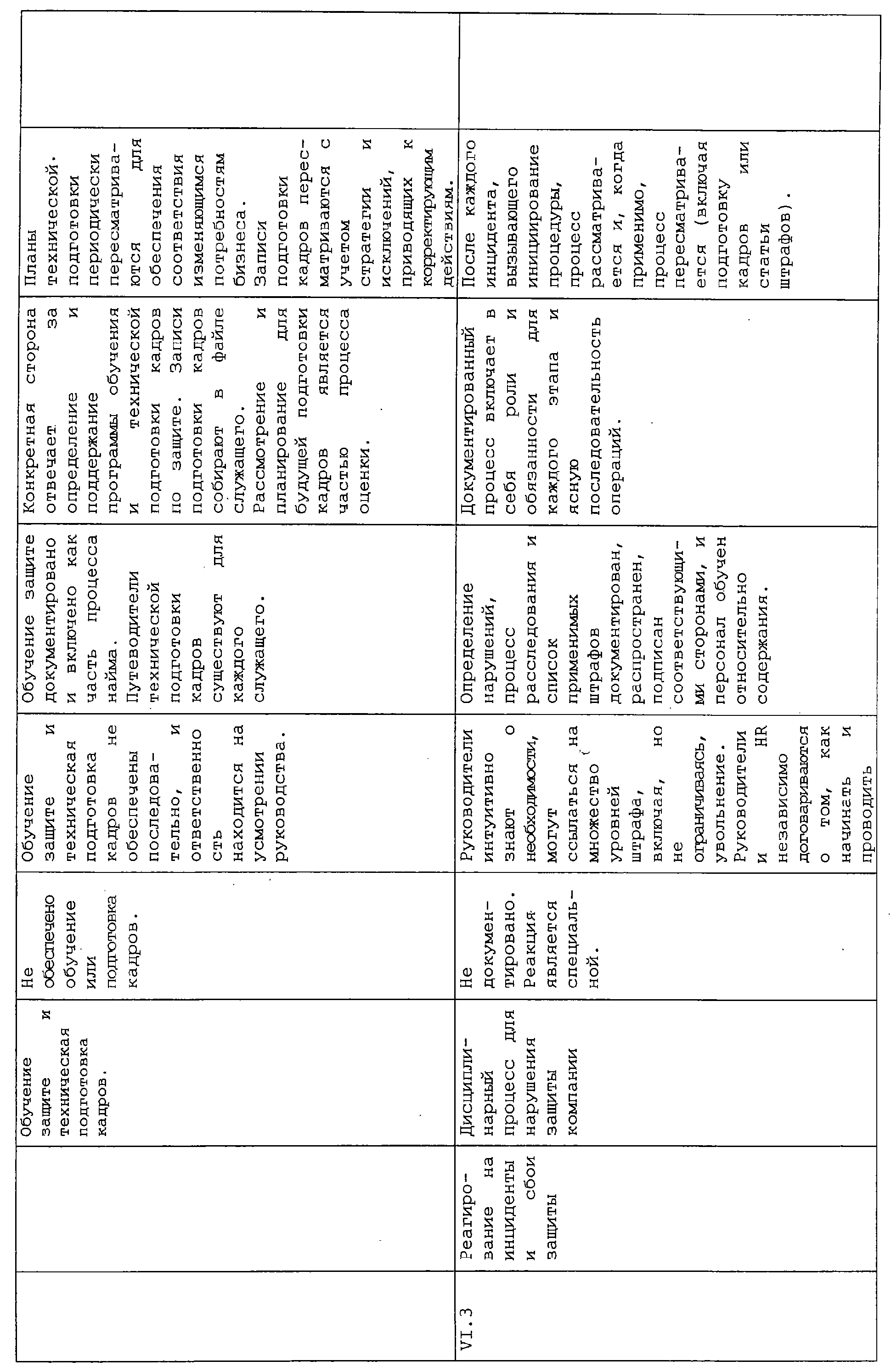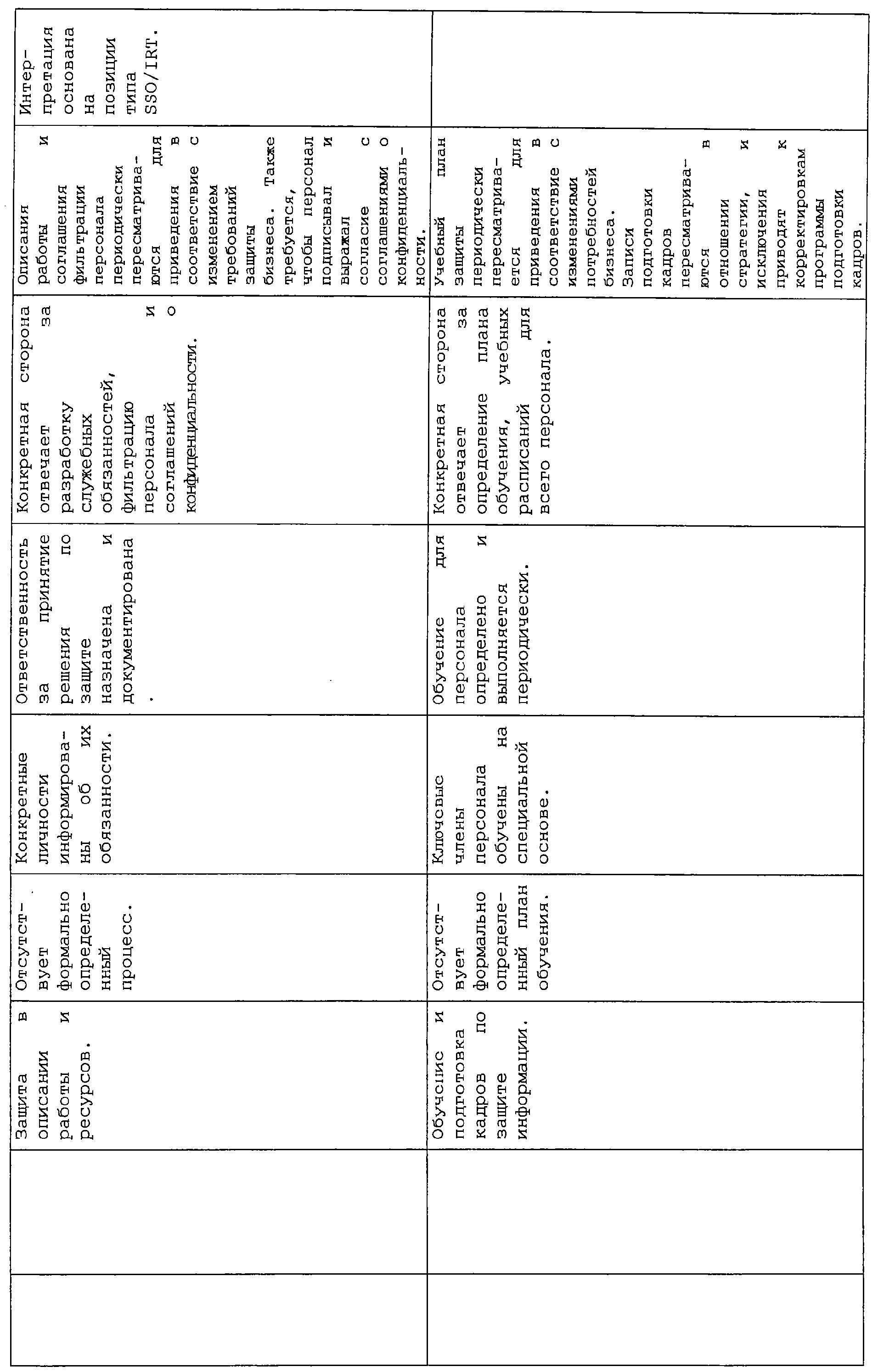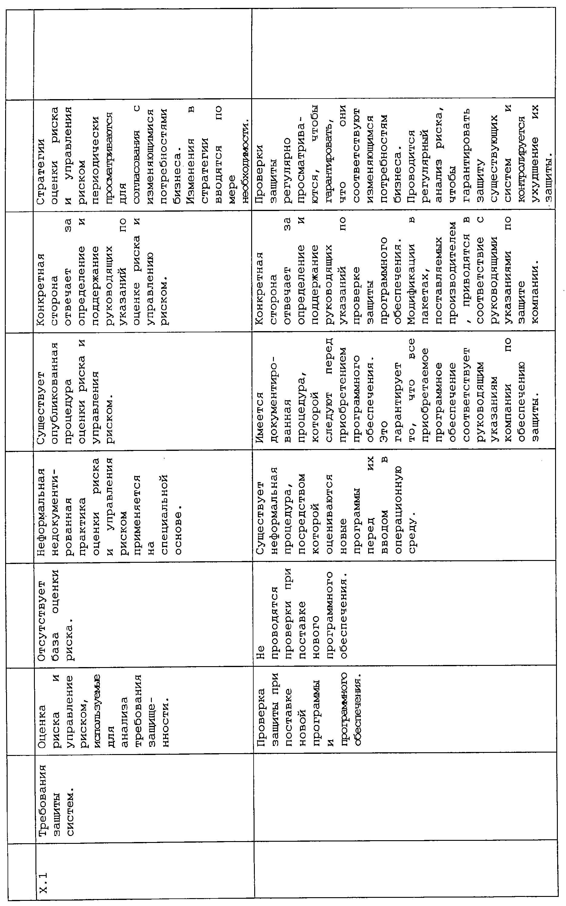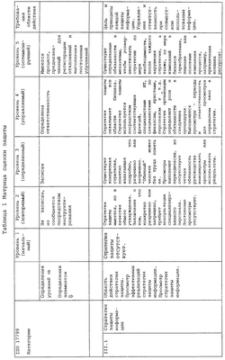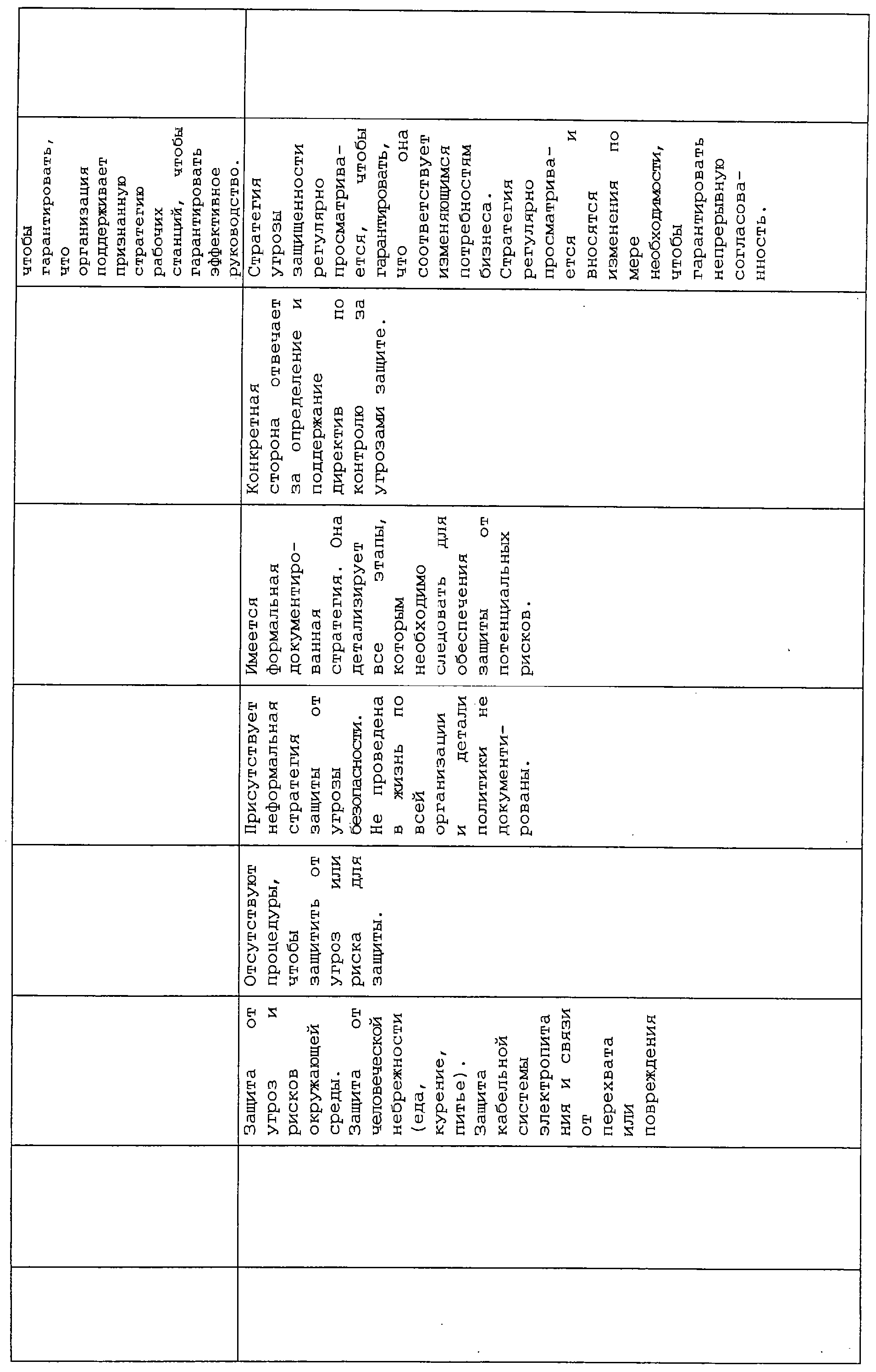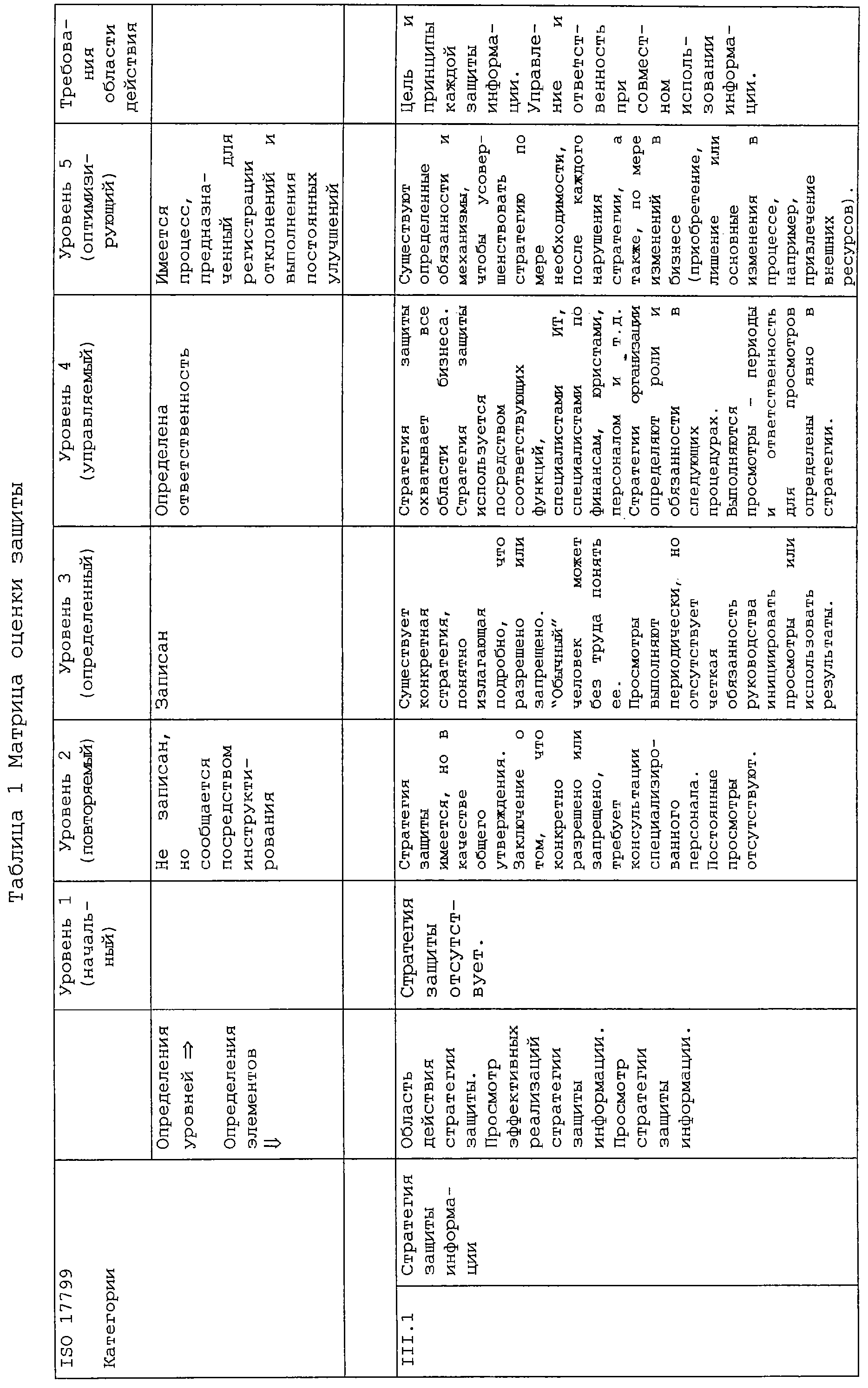 Изобретение относится к способу, предназначенному для оценки зрелости защиты организации. Кроме того, изобретение относится к способу, предназначенному для оценки зрелости защиты организации с использованием матрицы оценки защиты. Кроме того, изобретение предусматривает, что матрица оценки защиты основывается на стандарте BS7799/ISO17799 и Модели Зрелости Возможностей (модели СММ). Кроме того, изобретение относится к способу обеспечения количественных, ориентированных на действия результатов с использованием матрицы оценки защиты. Кроме того, изобретение относится к способу, предусматривающему сравнение зрелости защиты организации с заранее определенной целью, или со зрелостью защиты той же самой организации в другой момент времени, или с уровнем зрелости защиты, заданной другой организацией или администрацией.