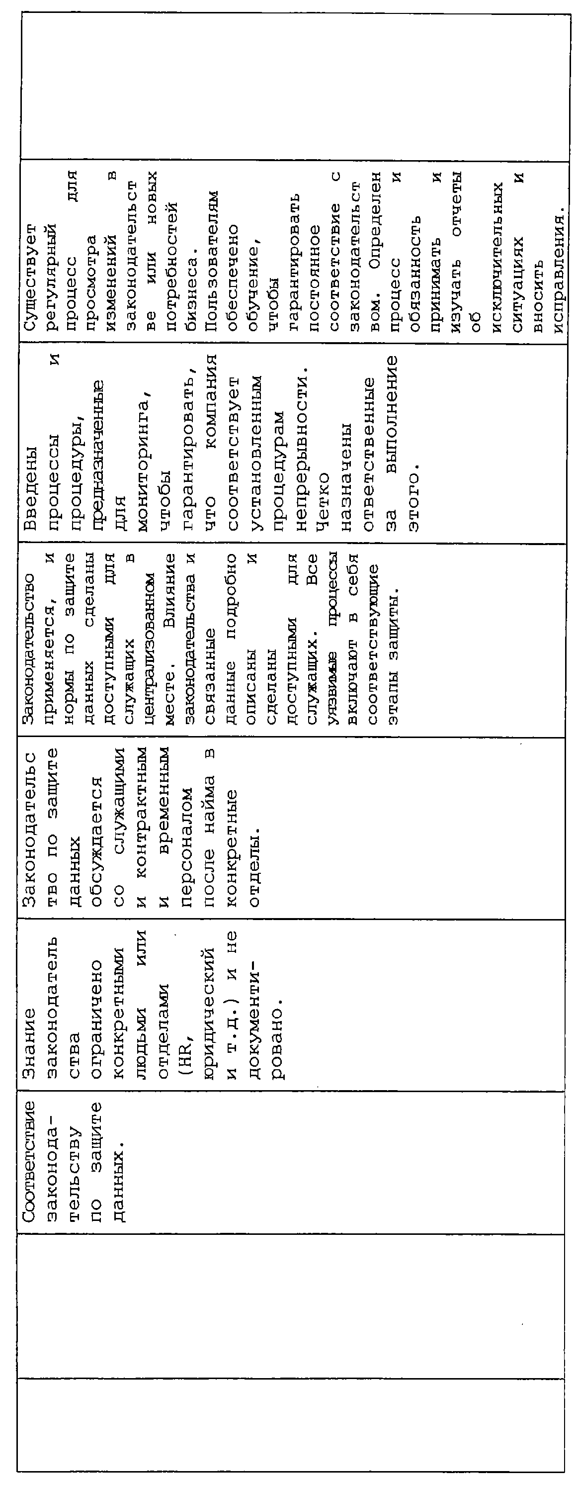 В одном или более вариантах осуществления изобретения определение элемента для каждого элемента защиты информации включено в МОЗ. Определение элемента действует как пояснение для определений уровней для конкретного элемента защиты информации. Кроме того, в одном или более вариантах осуществления изобретения МОЗ включает в себя определения уровней следующим образом: уровень 1 – начальный; уровень 2 – не записан, но сообщается посредством инструктирования; уровень 3 – записан; уровень 4 – определена ответственность; уровень 5 – существует процесс, предназначенный для регистрации отклонений и улучшения защиты информации, чтобы исключить их. Кроме того, в одном или более вариантах осуществления изобретения МОЗ включает в себя требования области применения. Требования области применения указывают, для каких различных аспектов операций организации должен быть применен критерий, сформулированный в конкретной строке МОЗ.