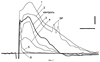 Через 5 мин происходило увеличение амплитуд АМПА и НМДА ВПСП примерно на 30% и 80% соответственно, а также возрастание амплитуды ПД ЛОТ по сравнению с контролем (фиг. 3, 1). Тормозный потенциал ТПСПм исчезал. На нисходящей фазе НМДА ВПСП возникали ЭР. Все эти модификации компонентов ФП указывают на повышение уровня возбудимости в нервных клетках и развитие потенциации под действием аутокрови. На 10-й мин потенциация сохранилась, но ее амплитудные характеристики уменьшились. Однако апериодические ЭР сохранились (фиг.3, 2). При продолжающемся воздействии аутокрови (25-40 мин) происходило уменьшение, по сравнению с исходными, амплитуд АМПА и НМДА ВПСП, но полной блокады механизмов их генерации не наблюдалось (фиг.3, 4-6). ЭР возникали, но были редкими и регистрировались с частотой 1/15 мин. После отмывания восстановление исходных параметров ФП не происходило, более того, наблюдалось даже снижение амплитуд АМПА и НМДА ВПСП по сравнению с 40-й мин действия аутокрови (фиг.3, 7).