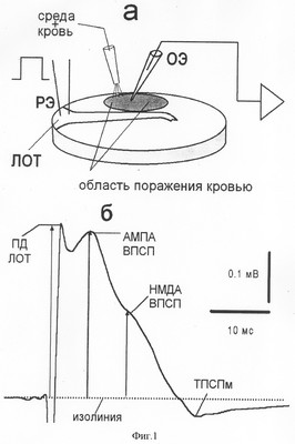 Способ осуществляют следующим образом. Подготовленные переживающие срезы заданных структур мозга (фиг.1, а) помещают в специальную камеру для регистрации вызванной биоэлектрической активности и фиксируют исходные параметры (фиг.1, б). Затем апплицируют на срез аутокровь, взятую из общей сонной артерии в объеме 0,5-5 мл на 25-40 мин и регистрируют при этом биоэлектрическую активность клеток. После чего отмывают срез от крови и регистрируют снова биоэлектрическую активность мозга.