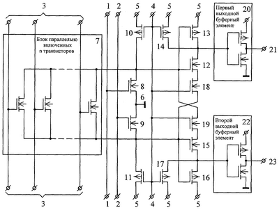 В другом случае, когда открыт транзистор 9 и транзистор 8 закрыт, на их затворы по адресным входам 2 и 1 поступают напряжения, соответственно, высокого и низкого уровней. Поэтому через открытый транзистор 9, узел, к которому подсоединен сток этого транзистора, разряжается до напряжения низкого уровня, которое, в свою очередь, поступает на истоки транзисторов блока 7, сток транзистора 11, затворы транзисторов 15 и 16 и исток транзистора 18. Это напряжение закрывает транзистор 15, открывает транзистор 16 и поступает через открытые транзисторы блока 7 и транзистор 18 на стоки транзисторов блока 7 и истоки транзисторов 12 и 19, затворы транзисторов 12 и 13 и стоки транзисторов 8 и 10. При этом транзистор 12 закрывается, а транзистор 13 открывается. Поэтому напряжение высокого уровня через открытые транзисторы 13 и 16 поступает, соответственно, на входы выходных буферных элементов 20 и 22, тем самым, удерживая на их выходах напряжение низкого уровня, т.е. выходы 21 и 23 дешифратора сохраняются в невыбранном состоянии.