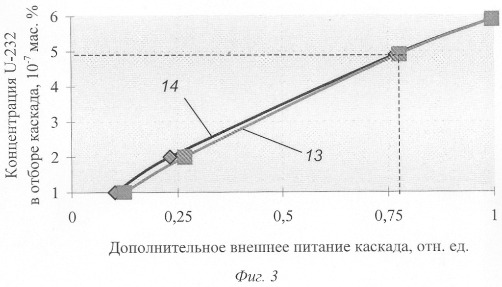 На фиг.3 кривые 13 и 14 – концентрация изотопа уран-232 в потоке 5 отбора каскада при смешении потока 4 дополнительного внешнего питания, содержащего гексафторид коммерческого натурального уранового сырья либо гексафторид слабо выгоревшей смеси изотопов натурального урана соответственно, с межступенными потоками 10m, 11m-1 и 12m+1 питания ступени с номером m. Пунктиром нанесена верхняя граница экономически обоснованного диапазона концентраций изотопа уран-232 в гексафториде восстановленной выгоревшей смеси изотопов урана [см.: Патент RU №2110855] и соответствующий ей относительный расход потока 3.