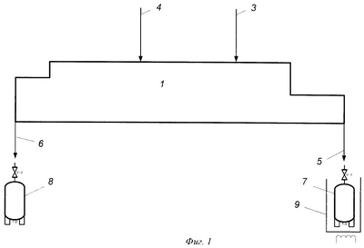 На блок-схеме фиг.1 показаны поток 3 основного внешнего питания (TRepU) каскада гексафторидом исходной выгоревшей смеси изотопов урана, поток 4 дополнительного внешнего питания (Tразб.) каскада гексафторидом изотопной смеси урана-разбавителя, поток 5 отбора в отборной части каскада – товарный гексафторид восстановленной смеси изотопов урана, поток 6 отбора в отвальной части каскада – гексафторид отвального урана (отвал обогащения). Позиции 7 и 8 – контейнеры, предназначенные для затаривания гексафторида восстановленной выгоревшей смеси изотопов урана и гексафторида отвального урана соответственно. Позиция 9 – автоклав для нагрева контейнера 7.
