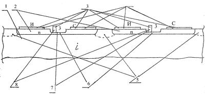 На чертеже дан фрагмент мощного СВЧ полевого транзистора с барьером Шотки, где: