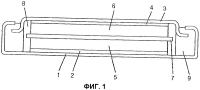 Фиг.1 представляет собой вид в разрезе обычной дисковой батареи (1: катодная сторона корпуса, 2: катодный токосъемник, 3: анодная сторона корпуса, 4: анодный токосъемник, 5: катод, 6: анод, 7: сепаратор, 8: электролит, 9: прокладка (уплотнение));