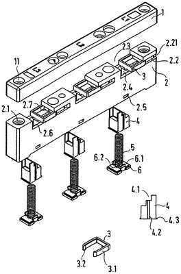 Приемные элементы 2.3 могут варьироваться по своей толщине (глубине) и ориентированной в продольном направлении нижней части 2 ширине посредством вставленных салазок 3 и, соответственно, раздельных от них установочных вкладышей 4, чтобы осуществлять подгонку к сборным шинам разной ширины и/или толщины. Для вставки салазок 3 на ограничивающей приемный элемент 2.3 шин в направлении ширины боковой стенке вставлены параллельно нижней стороне приемного элемента 2.3 шин, смежно – на обеих внешних сторонах нижней части 2, направляющие пазы 2.2 U-образной формы в поперечном сечении, нижняя сторона которых проходит в данном случае заподлицо с нижней стороной приемного элемента 2.3 шин и ширина которых подогнана к толщине салазок 3, ориентированной в направлении глубины приемного элемента 2.3 шин, причем боковые полки 3.1 U-образных салазок 3 подвижно установлены в направляющих пазах 2.2. В основании (дне) направляющих пазов 2.2 в их обращенной к приемному элементу 2.3 шин конечной области и их обращенной от приемного элемента 2.3 шин конечной области образованы фиксирующие элементы 2.21 в форме углублений, в которые под пружинящим действием боковых полок 3.1 защелкиваются отформованные на внутренних сторонах боковых полок 3.1, в их конечных областях, фиксирующие носики 3.2, когда упомянутые салазки 3 вдвинуты полностью или, соответственно, приведены в вытянутое положение. Кроме того, в полностью вдвинутом положении U-образная перемычка салазок 3 находится полностью в выемке 2.7, образованной между обоими упомянутыми направляющими пазами 2.2 в соответствующей боковой поверхности приемного элемента 2.3 шин, так что приемный элемент 2.3 шин неограниченно доступен по своей глубине. В вытянутом состоянии салазок 3 они находятся на нижней стороне приемного элемента 2.3 шин нижней стороной своих боковых полок 2.1 и своей U-образной перемычкой, так что приемный элемент 2.3 шин соответственно ограничивается по своей глубине, и вставленная сборная шина стабильно фиксируется относительно нижней части 2. Боковые полки 3.1 снабжены на своей внешней стороне шероховатой структурой, так что они могут переставляться легко и удобно для пользования. Предпочтительно также, что салазки 3 невыпадающим образом удерживаются в направляющих пазах 2.2 нижней части 2.