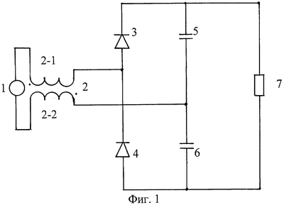 При положительном напряжении на источнике 1 (фиг.1) ток течет по цепи: первая 2-1 обмотка дросселя 2, диод 3, первый конденсатор 5, вторая 2-2 обмотка дросселя 2. Конденсатор 5 заряжается до напряжения, равного: