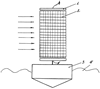 На чертеже изображен предложенный ЭЭГТ, где 1 – электрод, 2 – емкость из диэлектрической сетки, 3 – плавсредство, 4 – вода. Стрелками условно показано направление потока воздуха.