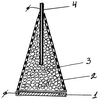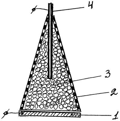 Работа устройства происходит следующим образом. Проникающий сквозь сетку 2 и между гранулами 3 или крошками заполнения поток воздуха заряжает их благодаря трибостатическому эффекту. Одновременно под давлением воздушного потока гранулы 3 заполнения трутся друг о друга и о сетку, при этом заряжаются электростатически. Этот электростатический заряд суммируется с зарядом от трибостатического эффекта. Суммарный заряд повышает эффективность электрогенератора.