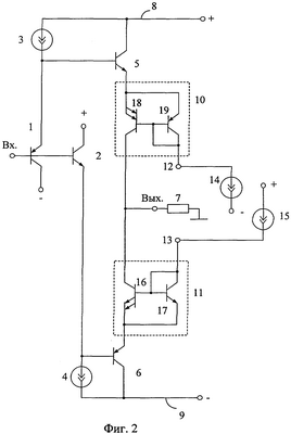 В выходном каскаде фиг.3 первое токовое зеркало 10 выполнено на n-p-n выходном 16 и n-p-n входном 17 транзисторах. Второе токовое зеркало 11 реализовано на p-n-p выходном 18 и p-n-p входном 19 транзисторах, причем эмиттеры входных и выходных транзисторов каждого из токовых зеркал 10 и 11 соединены друг с другом, а база и коллектор входного транзистора соединена с базой выходного транзистора и управляющим токовым входом токового зеркала (12, 13).
