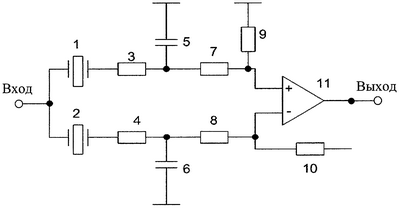 Из этого выражения следует, что данная схема при выполнении наложенных ограничений на элементы, будет соответствовать симметричной мостовой схеме и при соответствующем выборе параметров пьезорезонаторов может реализовать полосовую цепь. Кроме того, введение двух конденсаторов достаточно больших емкостей позволяет уменьшить выходное сопротивление схемы, подключаемой к сумматору, что практически снимает ограничение по увеличению входного сопротивления сумматора и тем самым позволяет производить достаточно точное суммирование напряжений, поступающих на его входы даже при небольших номиналах резисторов, входящих в его состав. Это позволяет значительно уменьшить шумы фильтра, обусловленные шумами резисторов сумматора.