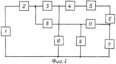 Устройство для питания импульсных ламп работает следующим образом. Открывается первый тиристор 3 и замыкает источник питания 1 через первый дроссель, величина которого выбирается из условия резонансного заряда, на первый конденсатор 10, который заряжается до заданного напряжения (Uзадрез). С помощью импульса, сформированного трансформатором поджига 5, импульсная лампа 4 приводится в проводящее состояние. После заряда первого конденсатора 10 до напряжения Uзад открывается второй тиристор 8, и второй конденсатор 9 заражается до Uзад, причем С2<С1. Включением четвертого тиристора 6 осуществляется процесс разряда первого и второго конденсаторов через второй дроссель 7 на импульсную лампу 4. По окончании оптической генерации импульсной лампы 4, не дожидаясь полного разряда первого конденсатора 10, осуществляется принудительное отключение импульсной лампы 4 путем включения третьего тиристора 11. Т.к. напряжение на втором конденсаторе 9 больше, чем напряжение на первом конденсаторе 10, то за счет напряжения на втором дросселе 7 четвертый тиристор 6 закрывается обратным напряжением, а второй конденсатор 9 разряжается до конца. При построении источника питания импульсных ламп предложенным образом разряд первого конденсатора 10 по окончании оптической генерации импульсной лампы 4 осуществляется не до нулевого значения, а прекращается принудительно при напряжении 0,5 Uзад, что позволяет значительно снизить время разряда конденсаторов на импульсную лампу и увеличить частоту повторения включения генерации лампы, что приводит к повышению выходной мощности ОКГ. Кроме того, осуществляя разряд первого конденсатора 10 не до нулевого значения, позволяет начинать его последующий заряд, экономя расход энергии источника питания 1. Для питания лампы ОКГ необходим источник питания мощностью в несколько мегаватт (в зависимости от типа лампы), который может быть построен на основе химических источников тока по комбинированной схеме с использованием в качестве обострителя мощности и источника высоковольтного напряжения батарей молекулярных конденсаторов, выполняющих функции буферного источника энергии для заряда молекулярных конденсаторов. Батареи молекулярных конденсаторов создаются на базе емкостных накопителей типа МНЭ – 3/60 или 24ПП – 30/0,003; аккумуляторные батареи – 10НКБ-90, как буферный источник энергии.